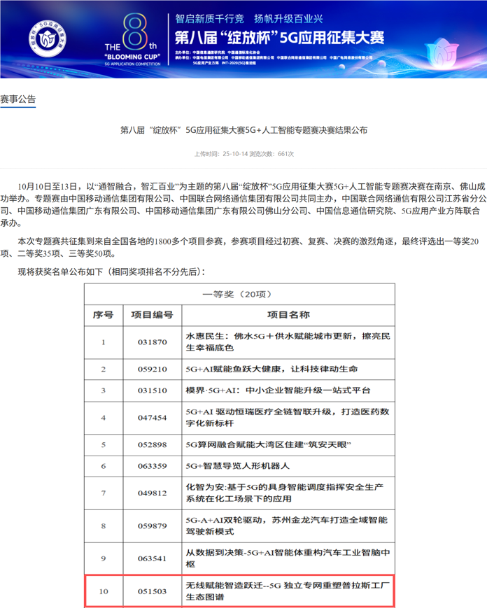 近日,第八届“绽放杯”5G应用征集大赛5G+人工智能专题赛决赛在南京和佛山两地圆满落幕。在全国征集的1800余个项目中,由四川省宜宾普拉斯包装材料有限公司和中国联合网络通信有限公司宜宾市分公司联合申报的“无线赋能智造跃迁—5G独立专网重塑普拉斯工厂生态图谱”项目,经历初赛、复赛、决赛的激烈角逐,最终脱颖而出,斩获该赛道一等奖。