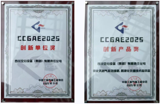 在展会颁奖典礼上,四川空分凭借在空分、天然气液化等领域的持续创新与卓越产品力,荣获“创新单位奖”,开发的核心技术和产品“液化天然气高效提氦、氦液化关键技术和装备”荣获大会颁发的“创新产品奖”。该产品打通了我国“天然气液化→天然气提氦→氦液化→液氦贮存”全产业链关键技术,主要性能指标达国际先进水平,彰显了四川空分在深冷技术领域的创新实力。