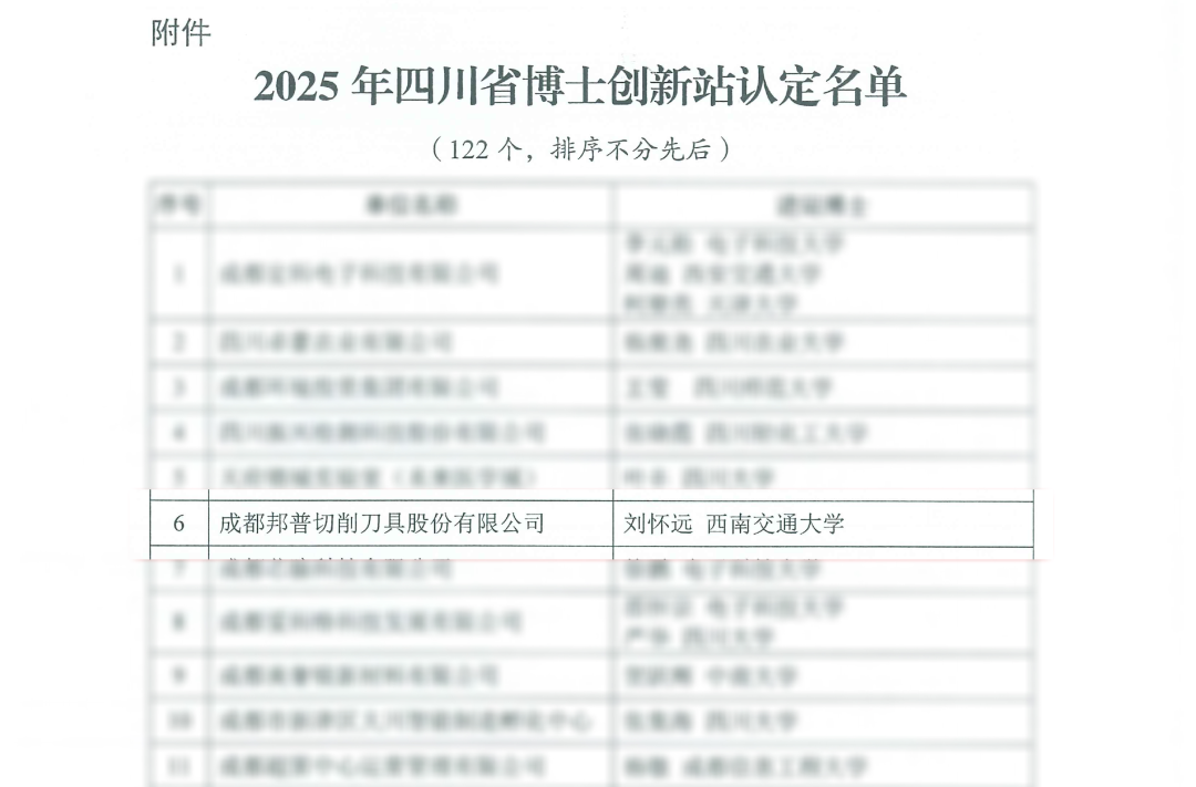 成都邦普切削刀具股份有限公司与刘怀远博士正式签署《四川省博士创新站共建协议》,并成功入选"2025年四川省博士创新站"认定名单!这是公司推进产学研合作、提升创新能力的重要里程碑。