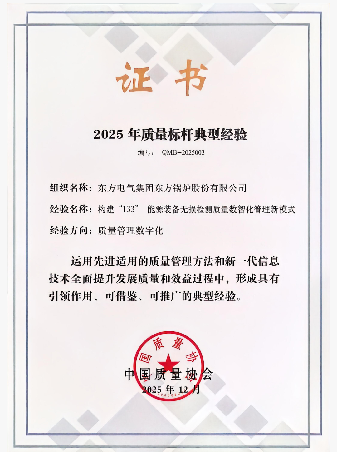 东方锅炉《构建“133”能源装备无损检测质量数智化管理新模式》立足能源装备安全可靠性要求高、焊接结构复杂、检测难度大等行业特点,全面构建“一个目标、三类路径、三大支撑”的质量管理模式,聚焦“质检方式数字化、质检过程自动化、结果评定智能化”三化突破,使质量控制从“缺陷检测”向“风险预防”、从“经验判断”向“智能决策”系统跃升。