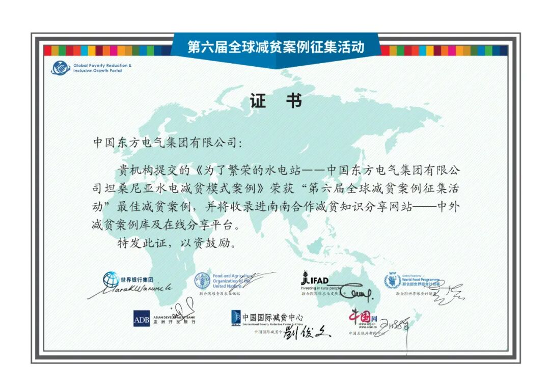 东方电气集团报送的《为了繁荣的水电站——中国东方电气集团有限公司坦桑尼亚水电减贫模式案例》,从全球40个国家和地区提交的840个案例中脱颖而出,入选最佳减贫案例,并将被收录进南南合作减贫知识分享网站——中外减贫案例库及在线分享平台,向全球推广“东方”减贫经验。