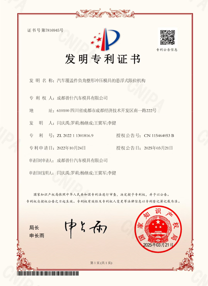 2025年,普什汽模公司相继获得5项国家发明专利授权,涵盖汽车模具成型工艺、限位机构、参数化设计、温控技术及数控加工多个核心领域。