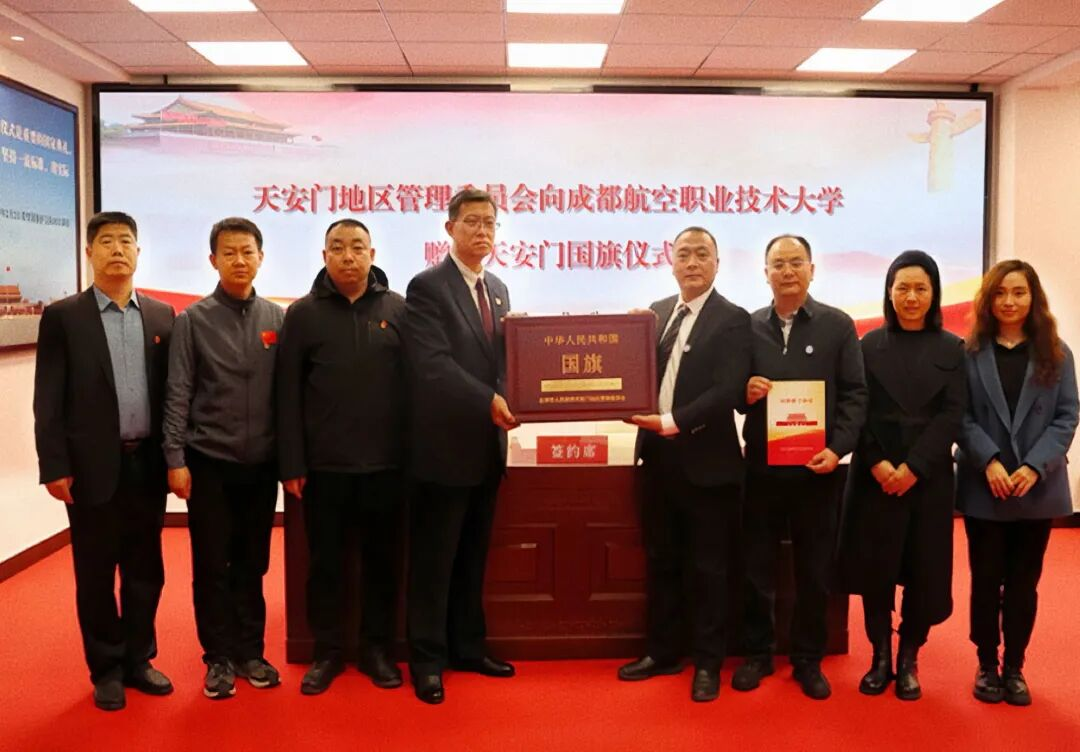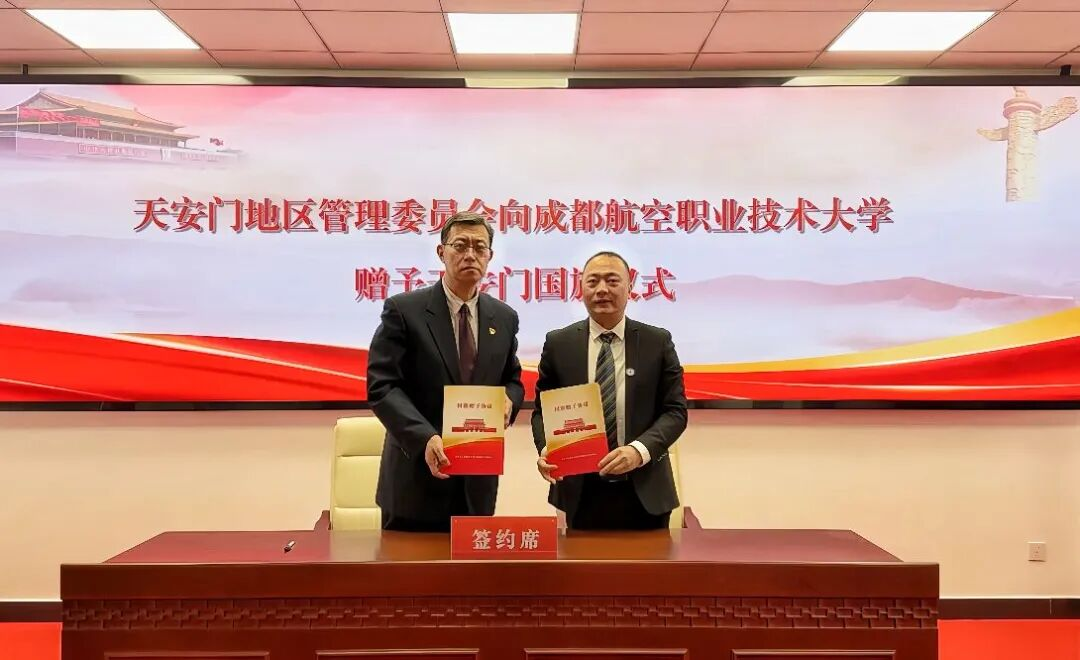 2025年12月17日下午,北京市人民政府天安门地区管理委员会赠送天安门国旗仪式在天安门国旗教育馆举行。天安门地区管委会党组成员、副主任姚辉,成都航空职业技术大学党委副书记谢亮冯代表双方签署天安门广场专用国旗赠予协议,学校正式受赠天安门国旗。