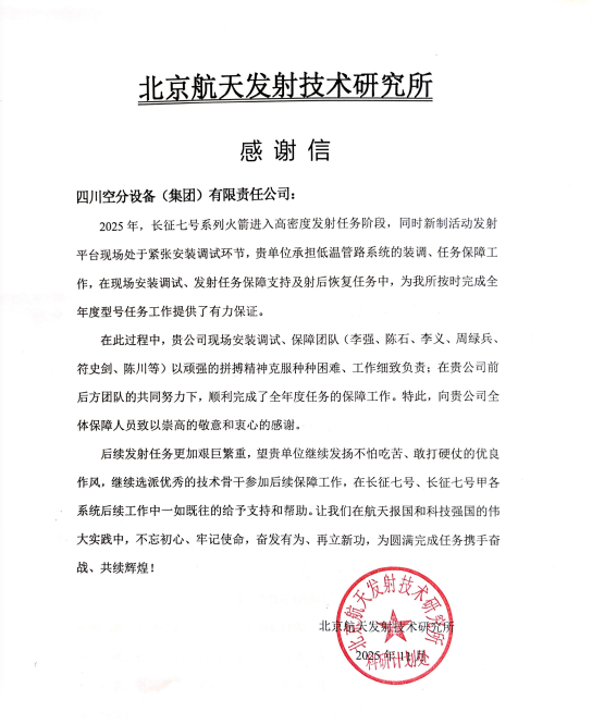 接连收到的感谢信既是肯定与激励,也是责任与鞭策。四川空分集团将始终以“服务国家战略,助力航天强国”为使命,践行“一切为了用户、一切为了发展”的企业精神,持续为祖国航天事业贡献专业力量。