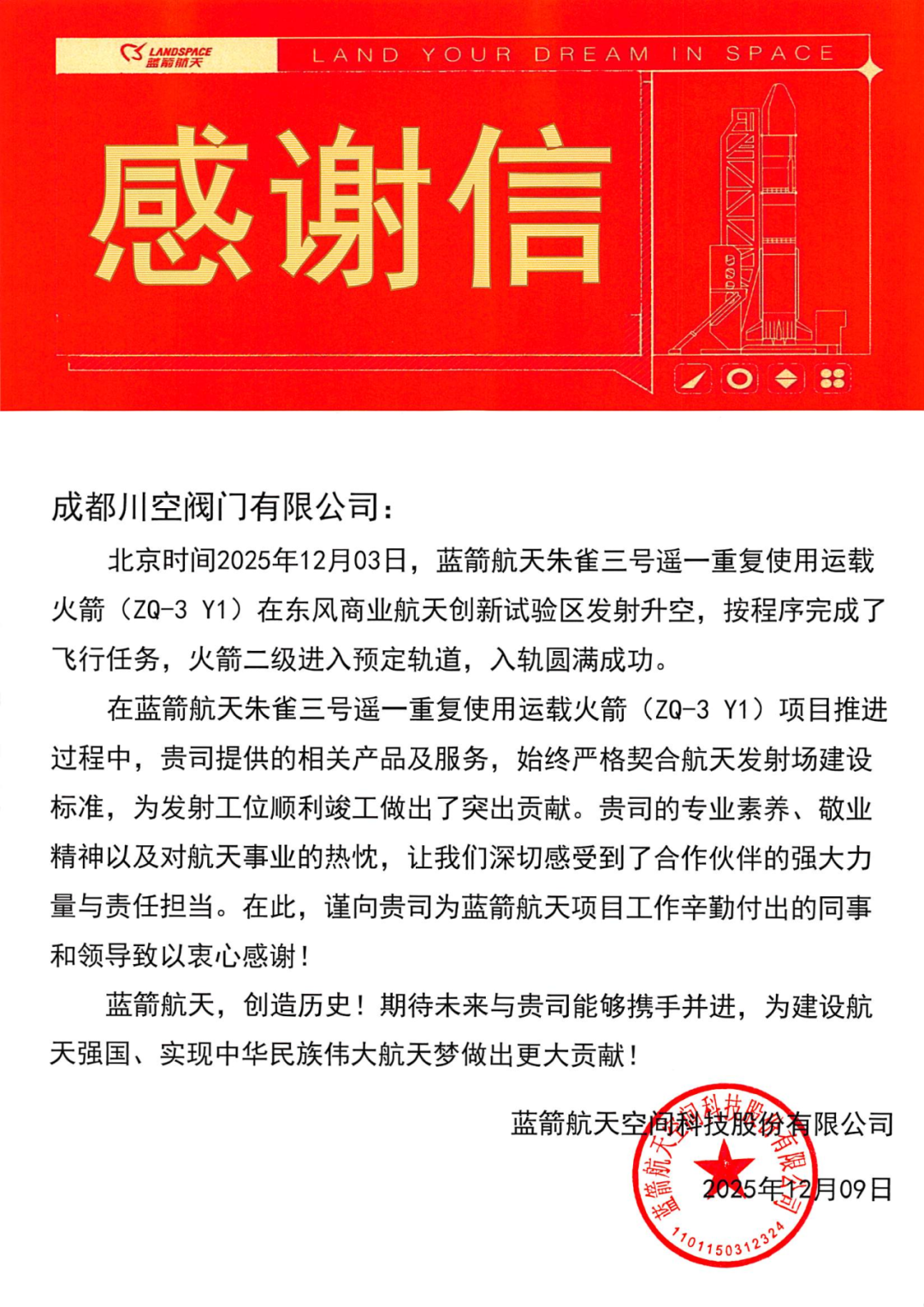 同月,四川空分集团成都川空阀门有限公司收到蓝箭航天空间科技股份有限公司发来的感谢信。在此次任务中,川空阀门承担了航天深冷供配气系统全部管路阀门任务,涉及27种规格,其中19种属全新设计开发。面对时间紧、任务重、标准极高的挑战,公司迅速成立专项组,凝聚技术骨干,全力以赴攻克了低温密封性能提升、真空环境适应性等诸多技术难题,圆满完成了产品交付,充分展示了川空阀门在低温阀门领域扎实的技术底蕴和可靠的生产保障能力。
