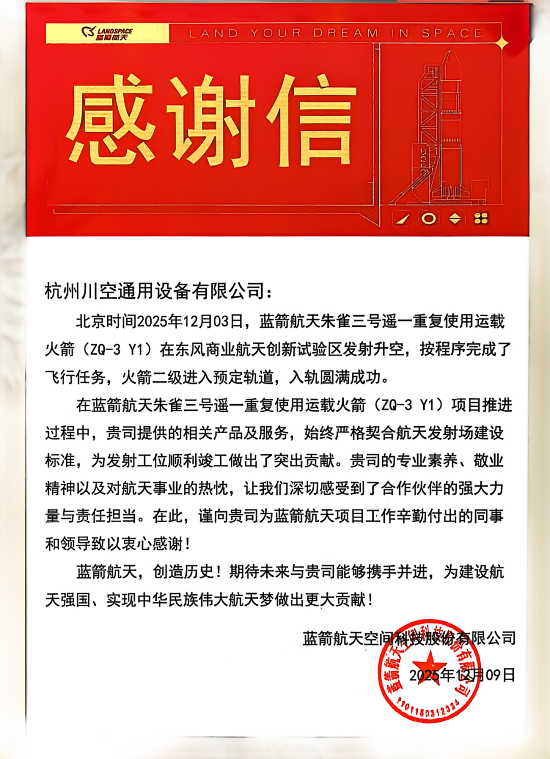 12月,四川空分集团杭州川空通用设备有限公司收到蓝箭航天空间科技股份有限公司发来的感谢信。在此次任务中,杭州川空负责提供液氧贮槽、液氮贮槽、甲烷贮槽等多项关键产品及服务,从设计到交付全程严格契合航天发射场建设标准,为发射任务圆满成功提供了重要保障,获得蓝箭航天官方的高度认可。