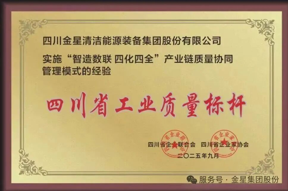 9月9日,金星集团以"智造数联 四化四全"产业链质量协同管理模式,荣膺"四川省工业质量标杆"称号,这是对公司卓越质量管理水平的高度认可。