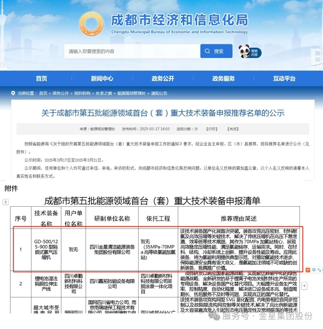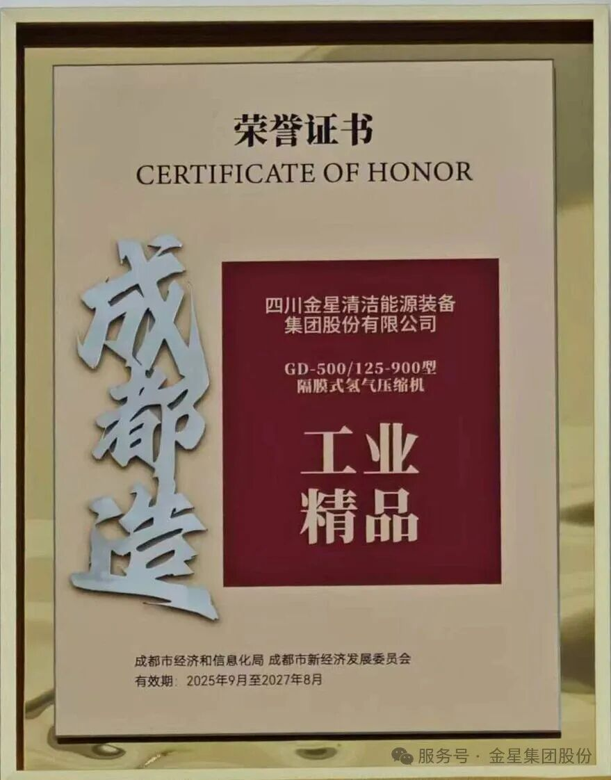 2025年,金星集团在氢能技术领域取得重大突破。"四川省氢能加氢装备中试研发平台"成功入选2024年第二批四川省中试研发平台名单,公司自主研发的GD-500/125-900隔膜式氢气压缩机荣登成都市第五批能源领域首台(套)重大技术装备榜单,标志着公司在氢能技术研发、成果转化和产业化应用领域迈入新阶段。