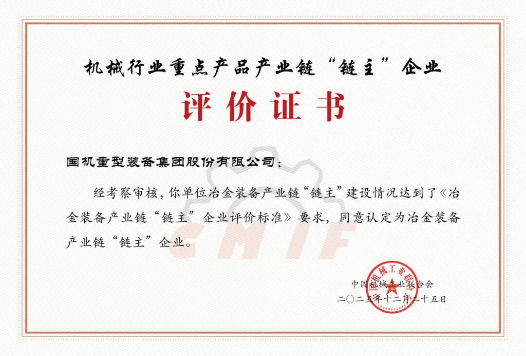 近日,国机重装顺利通过中国机械工业联合会机械行业重点产品产业链“链主”企业评价考核,获冶金装备产业链“链主”企业认定。