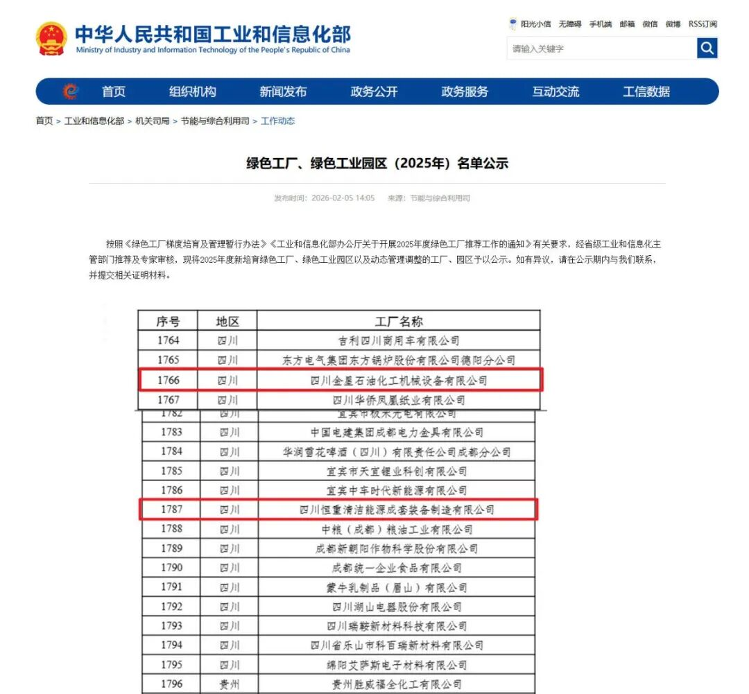 近日,工业和信息化部依据《绿色工厂梯度培育及管理暂行办法》《工业和信息化部办公厅关于开展2025年度绿色工厂推荐工作的通知》相关要求,经省级工信主管部门推荐、专家严格审核,公示了2025年度新培育国家级绿色工厂名单。金星集团股份公司全资子公司——四川金星石油化工机械设备有限公司、四川恒重清洁能源成套装备制造有限公司荣耀登榜,成功斩获“国家级绿色工厂”称号,彰显集团绿色转型与高质量发展的坚实成效。