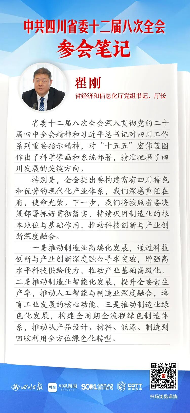 特别是,全会提出要构建富有四川特色和优势的现代化产业体系,我们深感重任在肩,使命光荣。下一步,我们将按照省委决策部署抓好贯彻落实,持续巩固制造业的根本地位与基础作用,推动科技创新与产业创新深度融合。