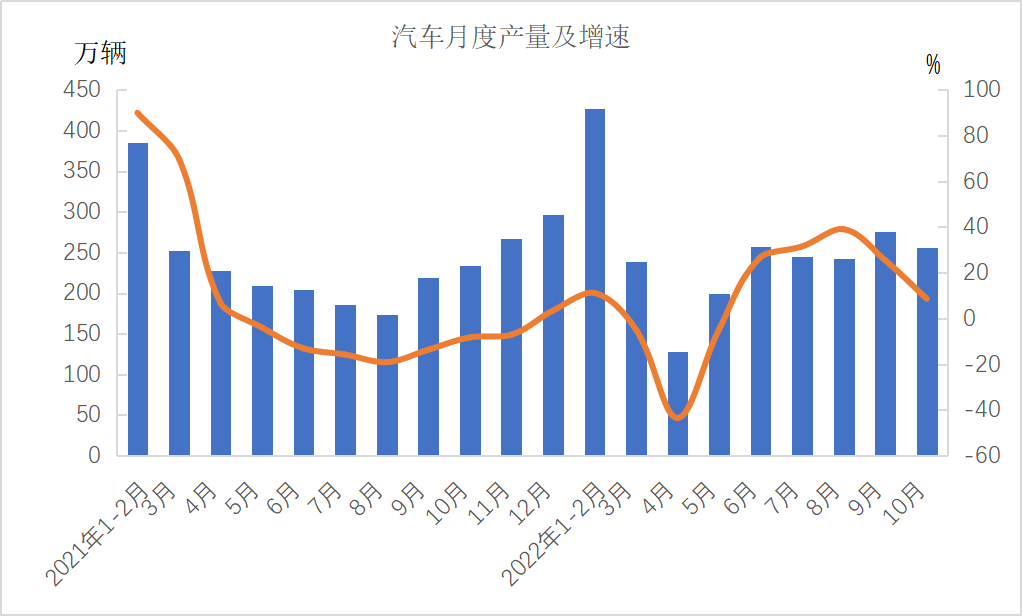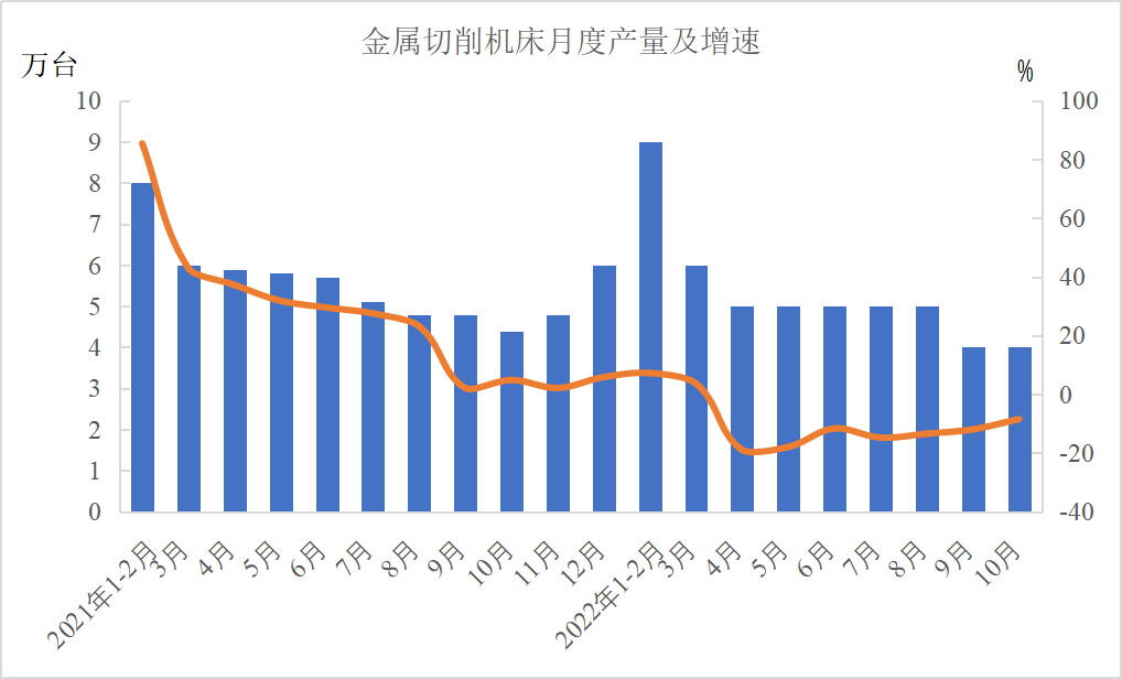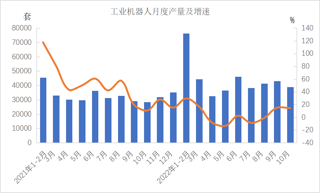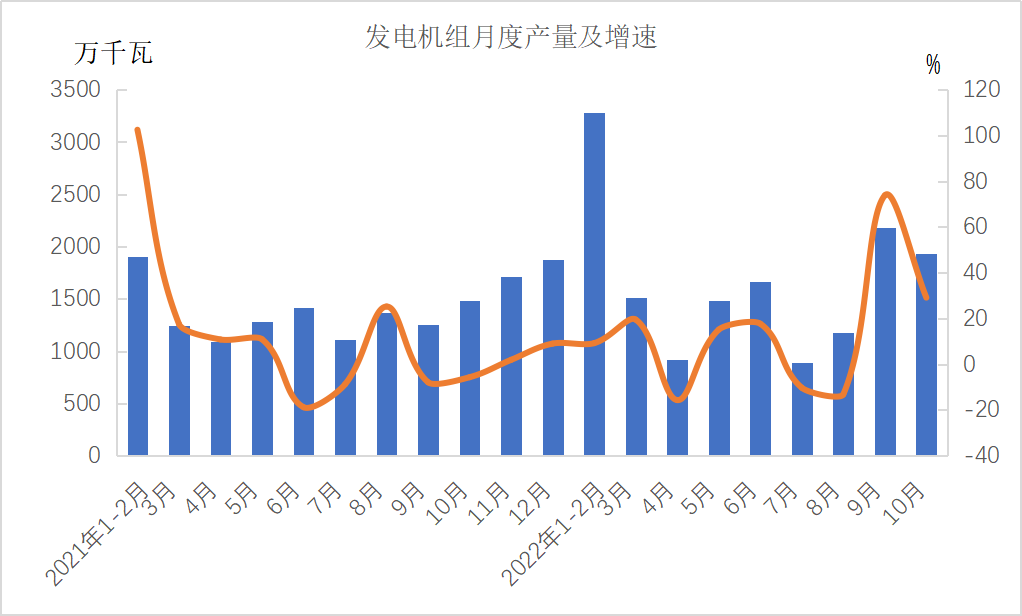 分产品看,1—10月份,金属切削机床47万台,下降12.5%;工业机器人362568套,下降3.2%;汽车2266.8万辆,增长8.1%,其中新能源汽车559万辆,增长108.4%;发电机组(发电设备)13850万千瓦,增长14.3%。